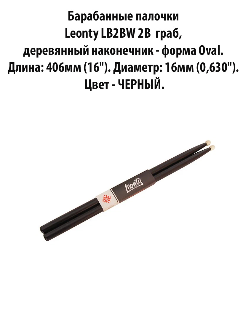 Барабанные палочки Leonty LB2BW 2B (Пр-во РБ) материал -граб, деревянный наконечник - форма Oval. Длина: 406мм (16"). Диаметр: 16мм (0,630"). Цвет - ЧЕРНЫЙ.