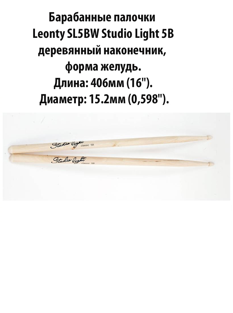 Барабанные палочки Leonty SL5BW Studio Light 5В (Пр-во РБ) деревянный наконечник, форма желудь. Длина: 406мм (16"). Диаметр: 15.2мм (0,598").