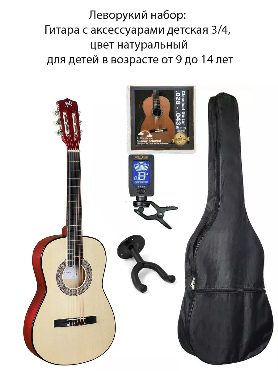 Леворукий набор: Гитара с аксессуарами детская 3/4, цвет натуральный Комплект разработан специалистами с участием педагогов музыкальных школ для детей в возрасте от 9 до 14 лет.