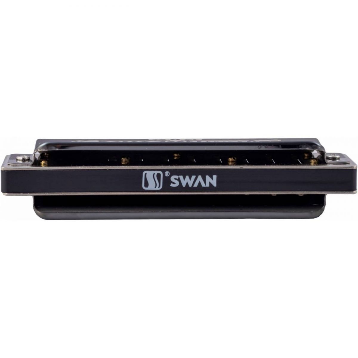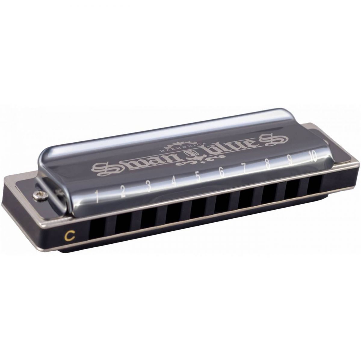 Классическая блюзовая губная гармошка Swan SW1020H-BK. Пластиковый корпус инструмента выполнен в черном цвете, крышки хромированные, также покрашенные в черный цвет.