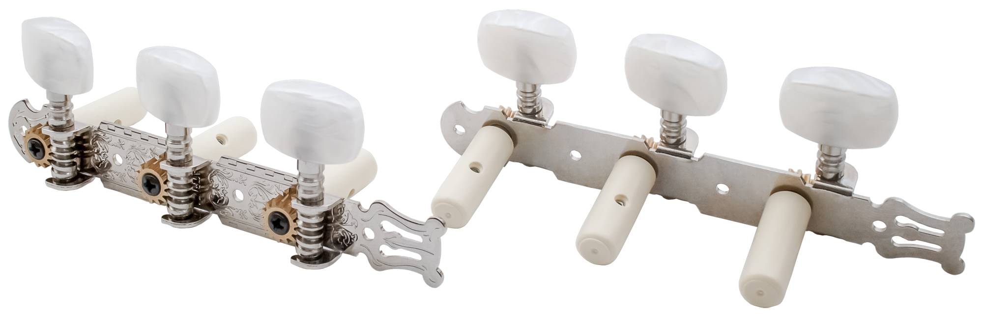 Пластиковая втулка, отверстие по центру. Передаточное число: 1:15. Расстояние между колками 35 мм. Диаметр посадочного отверстия 9 мм. Длина планки 123 мм. Барашки - пластик, белый перламутр, овальной формы. Покрытие - никель.