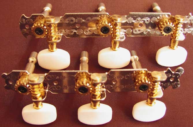 Данный комплект колковой механики используется в 6-ти струнных гитарах. Выпускаются два вида колковых механизмов - с межценровым расстоянием между крайними колонками 80 мм (на рисунке сверху) и с расстоянием 70 мм (на рисунке снизу).