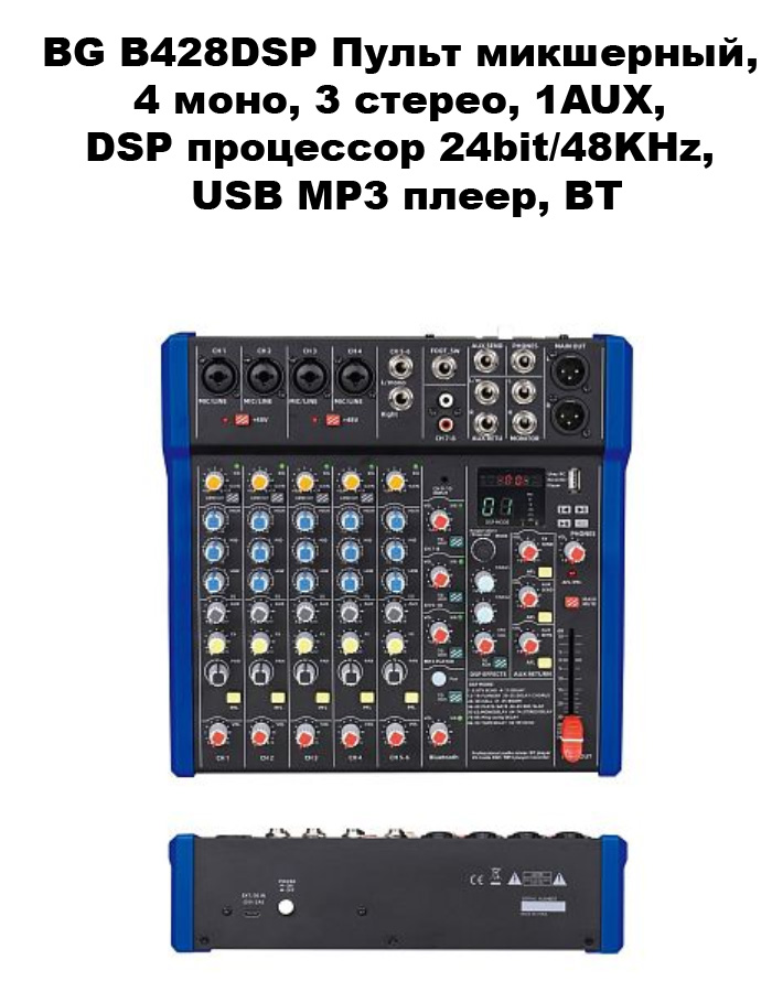 • 4 микрофонных входа + 3 стереовхода с разъемами 2 х джек 6,3мм, 2 х RCA и джек 3,5 мм стерео