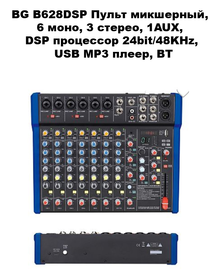• 6 микрофонных входа + 3 стереовхода с разъемами 2 х джек 6,3мм, 2 х RCA и джек 3,5 мм стерео