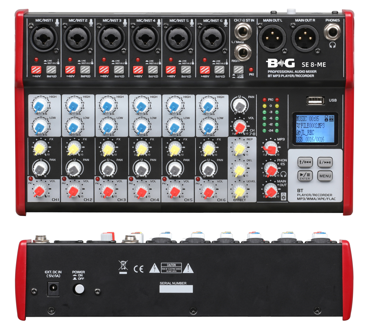 BG SE8-ME Пульт микшерный, 6 моно, 1 стерео, процессор эффектов, USB, MP3 плеер, BT, 2 полосный эквалайзер, фантомное питание
