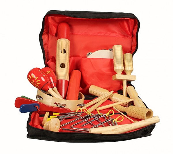 Перкуссионный набор состоит из 17-ти предметов: пары круглых тамбуринов разных диаметров с 4-мя парами металлических тарелочек; пары деревянных маракас с декорированным шейкером; 5-ти стальных треугольников с палочкой разного размера; шейкера; гуиро с палочкой; деревянной кастаньеты на ручке; пары деревянных клавес; пары деревянных кастаньет; тон-блока с палочкой; тон-блока двухтонового среднего с палочкой; тон-блока двухтонового маленького с палочкой; тон-блока-коробочки с палочкой. Набор упакован в компактную сумку и станет отличным подарком для тех, кто не равнодушен к музыке, а также подойдет детям в качестве первого знакомства с музыкальными инструментами.