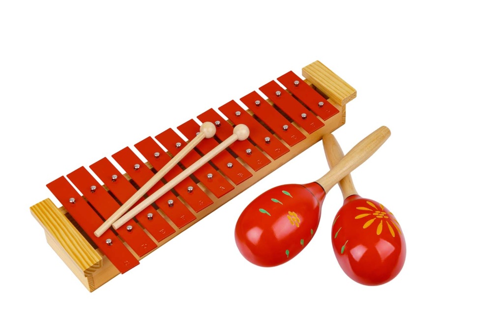 Ксилофон с металлическими пластинами и двумя деревянными палочками