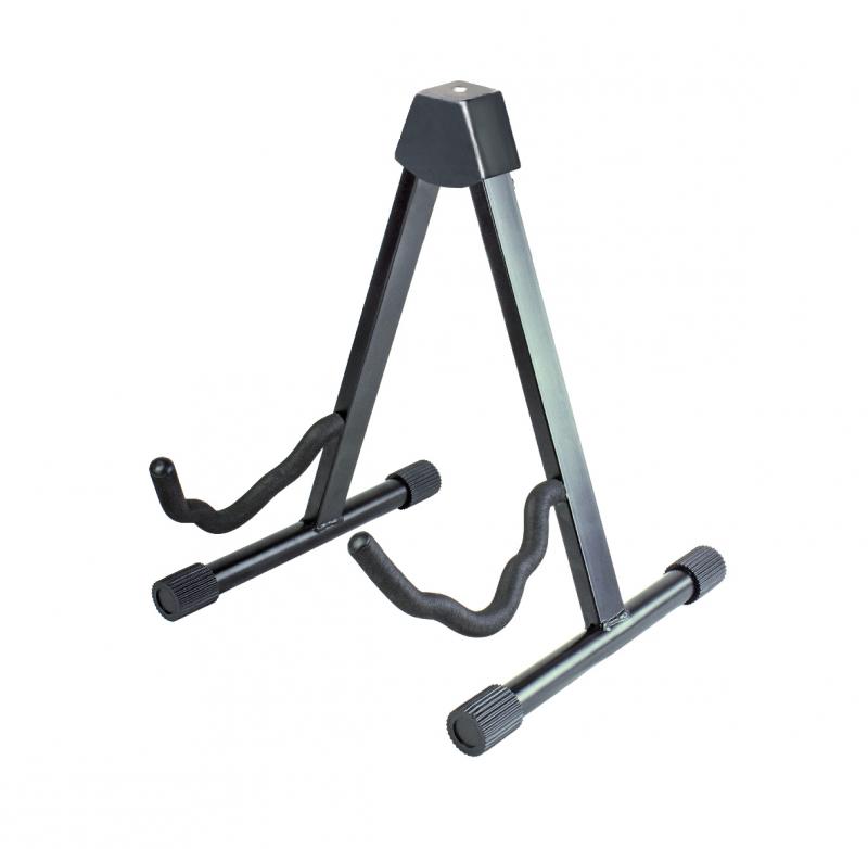 Удобная компактная стойка для гитары с универсальными кронштейнами. Подходит для акустической, электро- и бас- гитары, прочная конструкция, высококачественная фурнитура, защитное поролоновое покрытие кронштейнов, резиновая верхняя опора для предотвращения механических повреждений гитары, легко и удобно складывается, черная отделка.