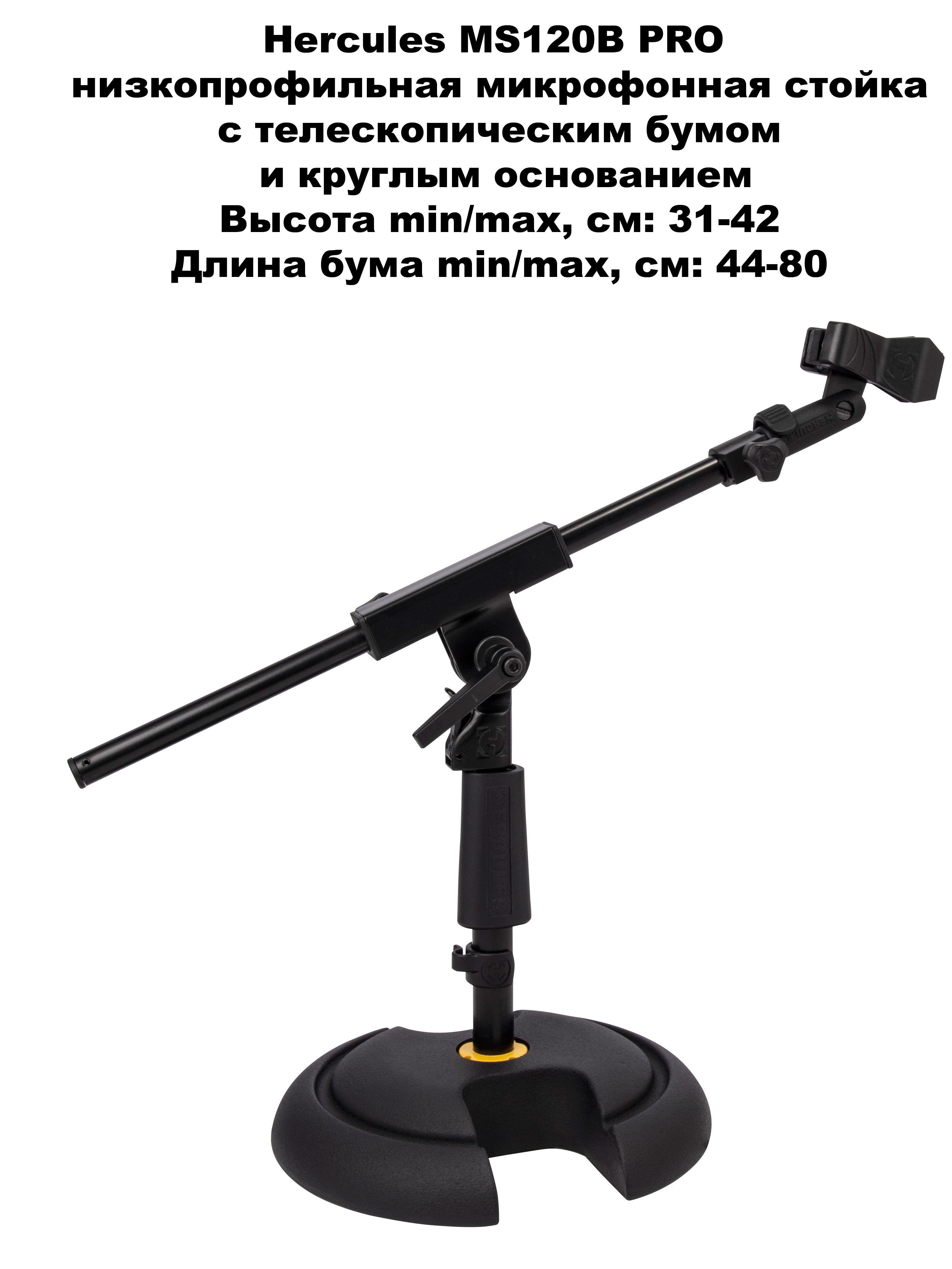 Стойка микрофонная Hercules MS120B PRO — это низкопрофильная стойка с телескопическим бумом и круглым основанием. Она идеально подходит для помещений с ограниченным пространством.